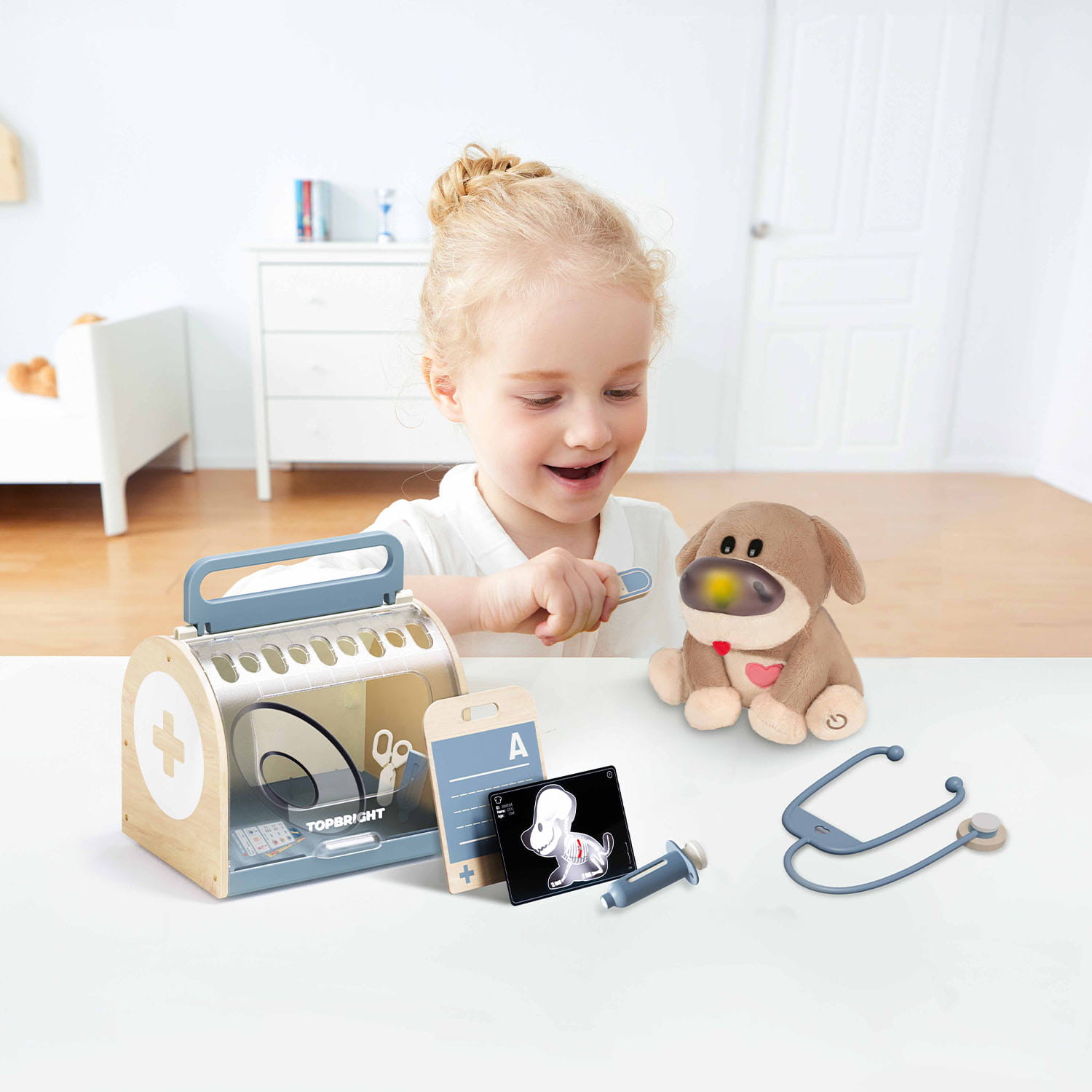 Dr. Dog – Topbright: interaktywny piesek ze świecącym nosem (kolory „objawów”), dźwiękami i bogatym zestawem lekarskim. Drewniany transporter w komplecie. 36 m+.