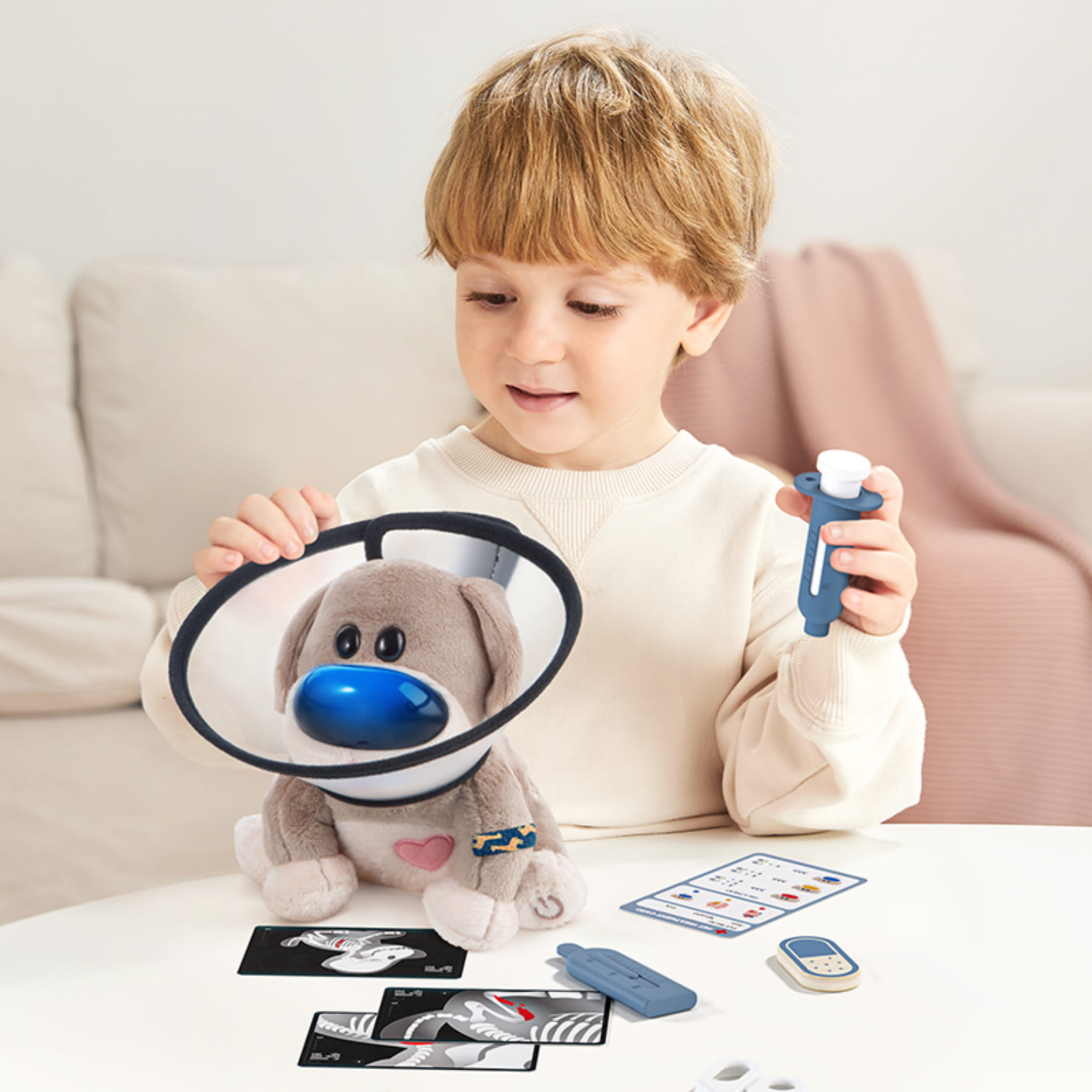 - Autentyczna opieka weterynaryjna – jak w prawdziwej klinice! – dziecko bada psa przy pomocy stetoskopu, podaje interaktywne tabletki, stosuje termometr lub interaktywną strzykawkę. W zestawie znajdzie też kołnierz ochronny oraz kartę diagnostyczną i zdjęcia rentgenowskie, dzięki którym może śledzić proces leczenia.