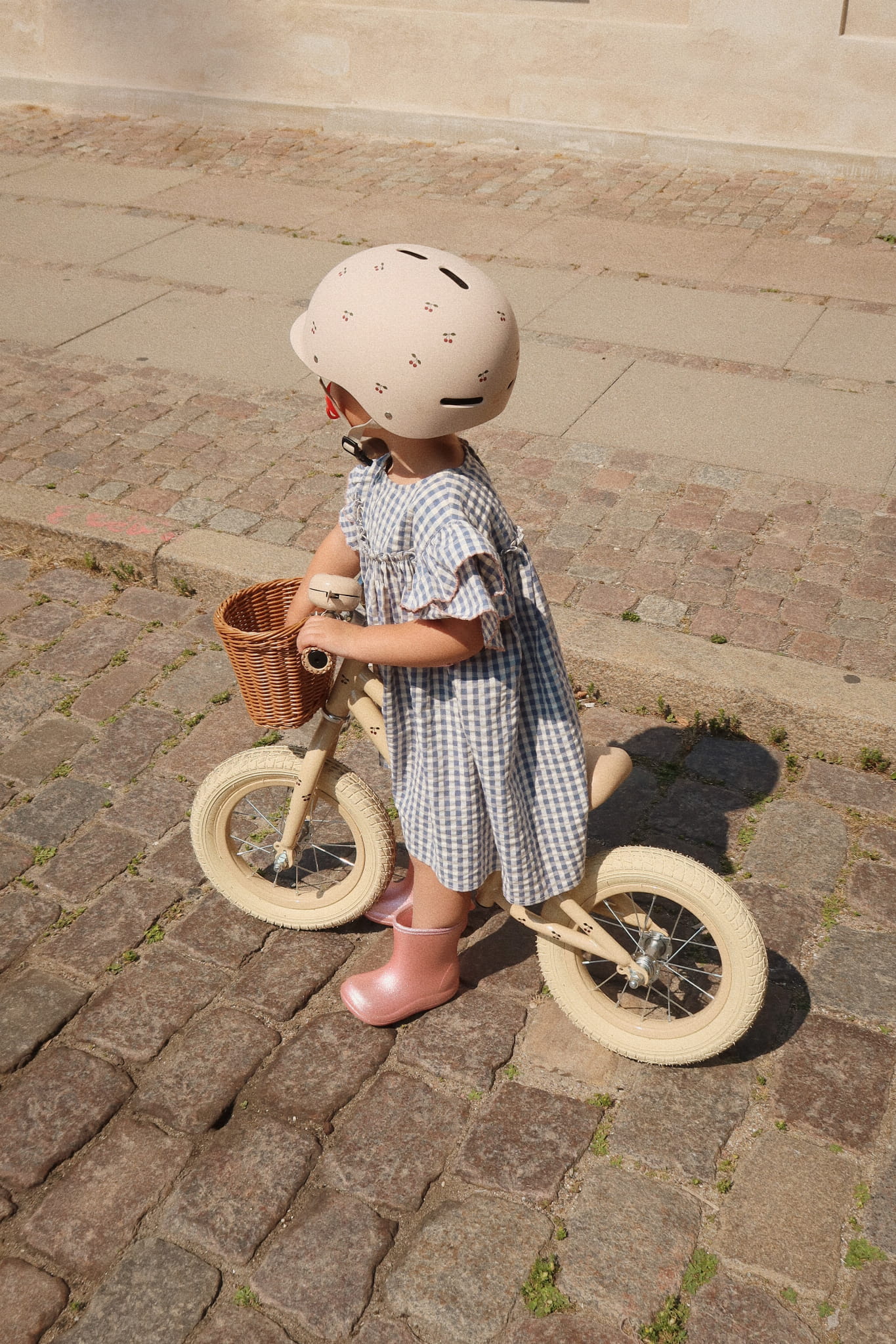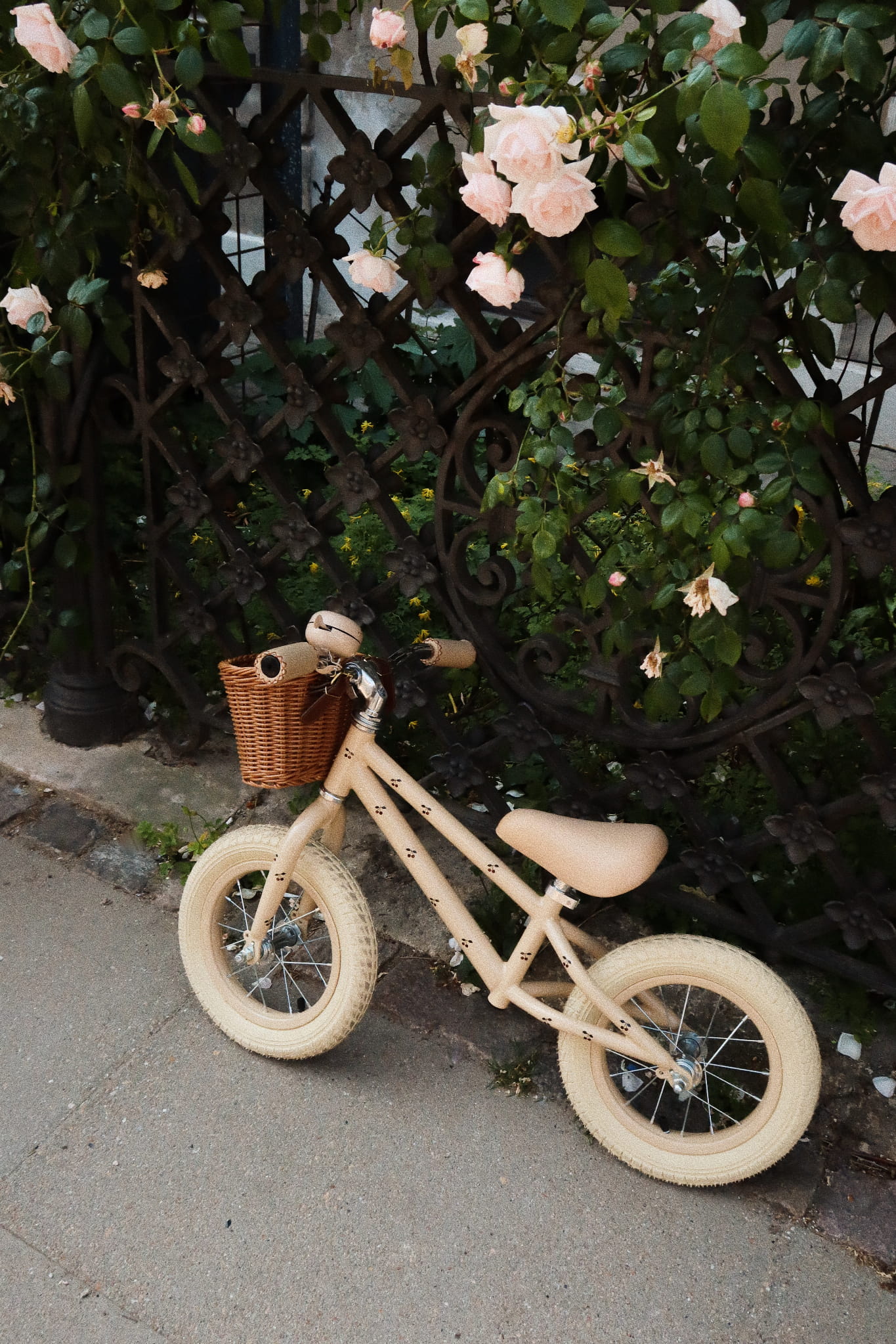 Rower równoważny Konges Slojd 12" w kolorze wiśniowym z koszykiem z wikliny. Stalowa rama, gumowe koła oraz regulowana kierownica i siodełko – dla dzieci 3+.