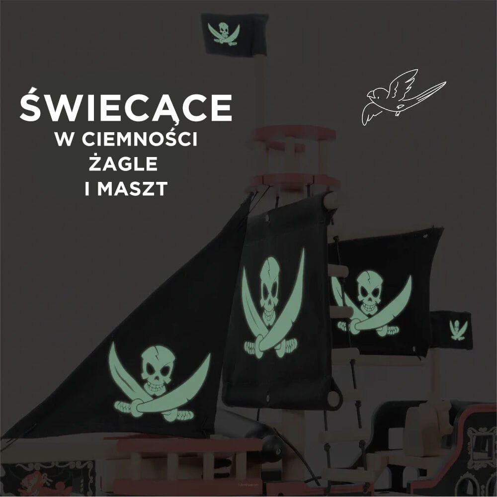 Ahoj Piraci! Oto klasyczny, pomalowany na intensywnie czarny kolor, drewniany statek piracki! Zawiera: bocianie gniazdo, pokład, po którym piraci mogą chodzić, takielunek, armatę strzelającą kulami, podciąganą kotwicę, klapę otwierającą pokład, ster oraz kładkę. Prawdziwie pirackie żagle i chorągiew świecą w ciemności. Zabawka nie zawiera plastiku, a w zestawie są 2 figurki piratów, którzy czekają by wyruszyć tam, gdzie horyzontu kres!