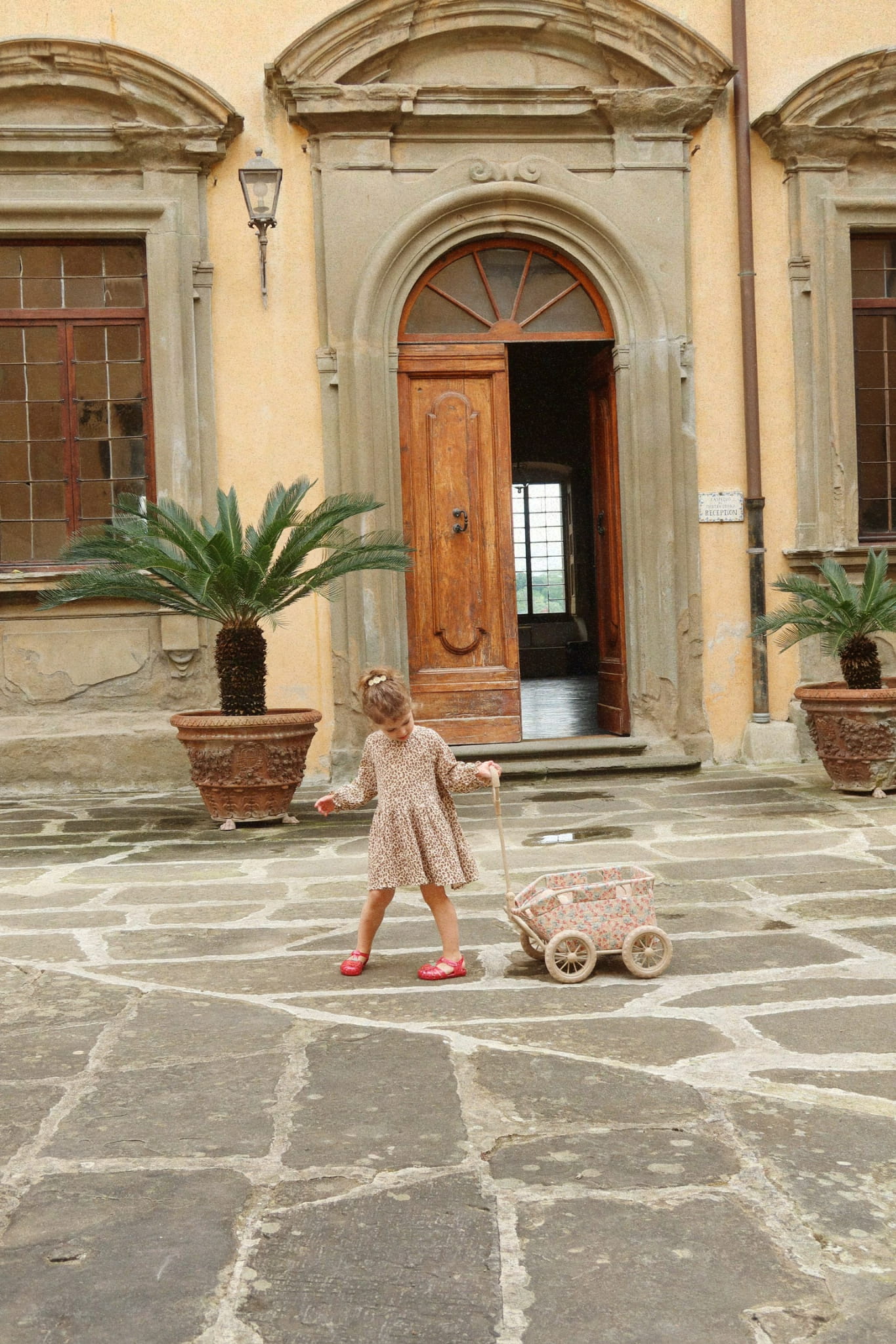 Coco Dress GOTS od Konges Sløjd to lekka, dziewczęca sukienka z przewiewnego muślinu. Swobodny fason i delikatnie marszczony dół zapewniają komfort noszenia, a print Leo nadaje jej charakterystyczny styl.