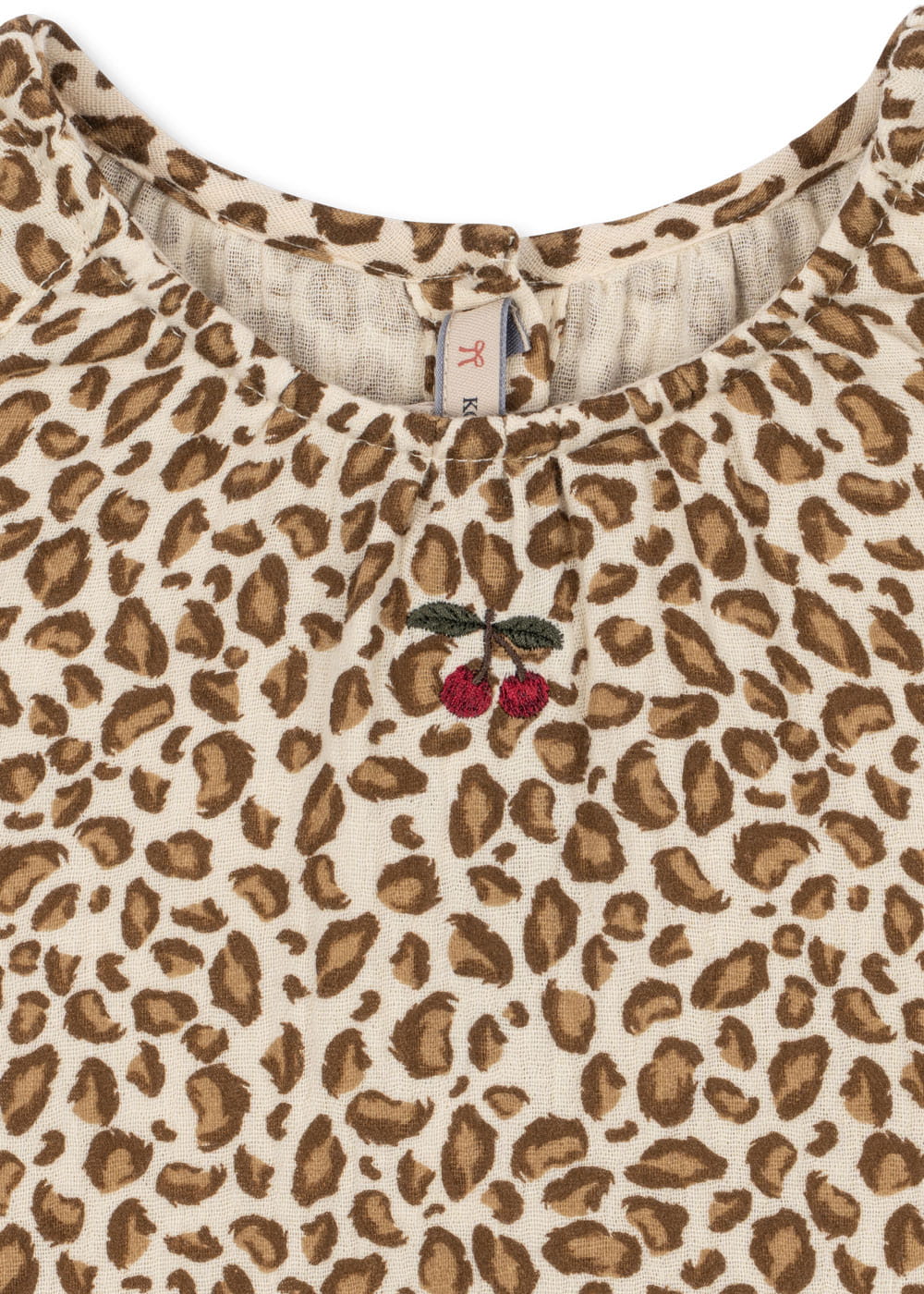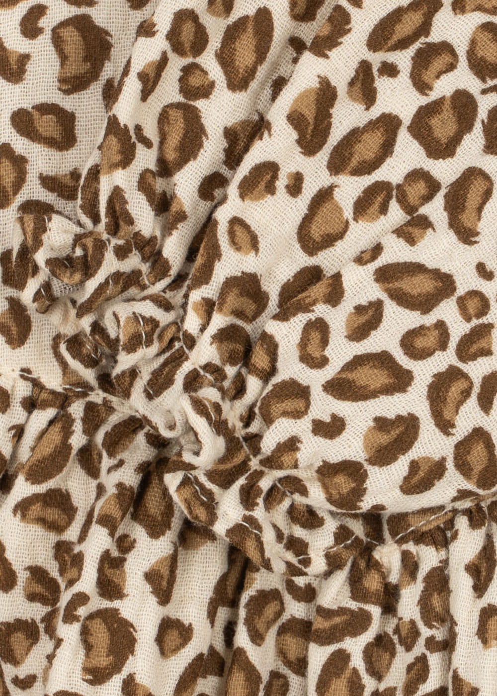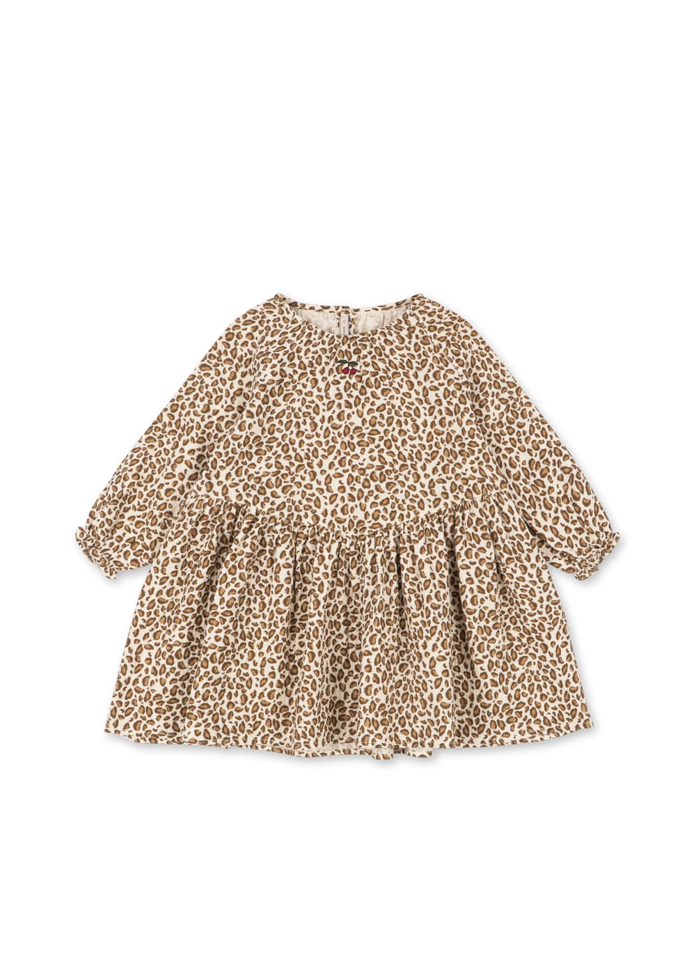 Konges Sløjd Coco Dress GOTS to lekka sukienka dziecięca z 100% bawełny organicznej. Model w print panterki (Leo) wykonany z oddychającego muślinu z certyfikatem GOTS.