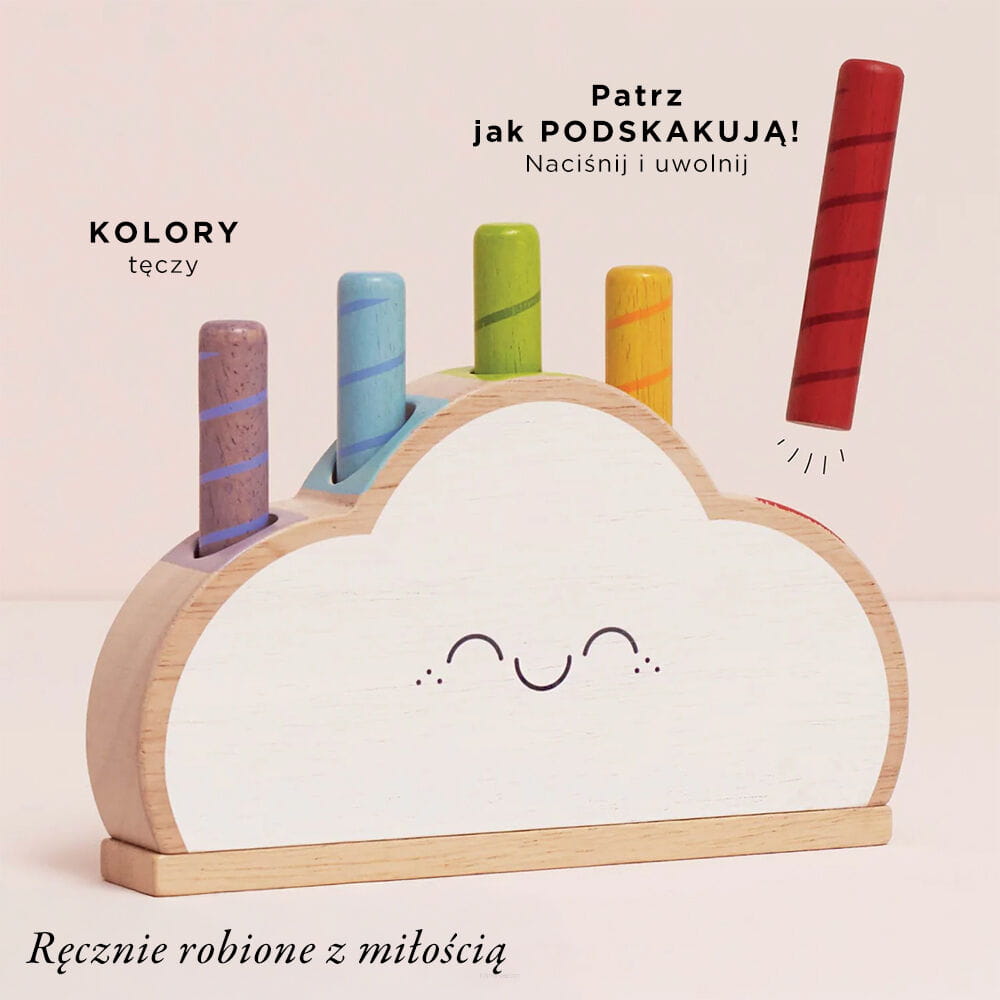 Przygotuj się na dużo wystrzałowej zabawy! Ta gra w kształcie uroczej chmurki to klasyczna zabawka edukacyjna, zaprojektowana w celu wspierania rozwoju poznawczego, koordynacji wzrokowo-ruchowej i zręczności Twojego dziecka. Małe dzieci pokochają tą interaktywną, drewnianą chmurkę, która posiada 5 kolorowych tęczowych patyczków wyskakujących na trzy różne wysokości. Naciśnij patyczki, poczekaj, aż wystrzelą i spróbuj złapać je, zanim spadną. Ta gra nie zawiera plastiku i gwarantuje tradycyjną zabawę dla całej rodziny. Mieszaj i dopasuj kolory lub przejdź na wyższy poziom: naciśnij-wystrzel-złap!