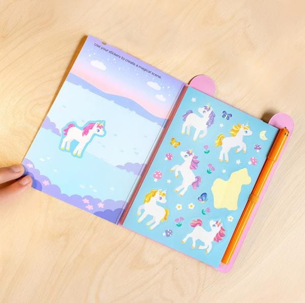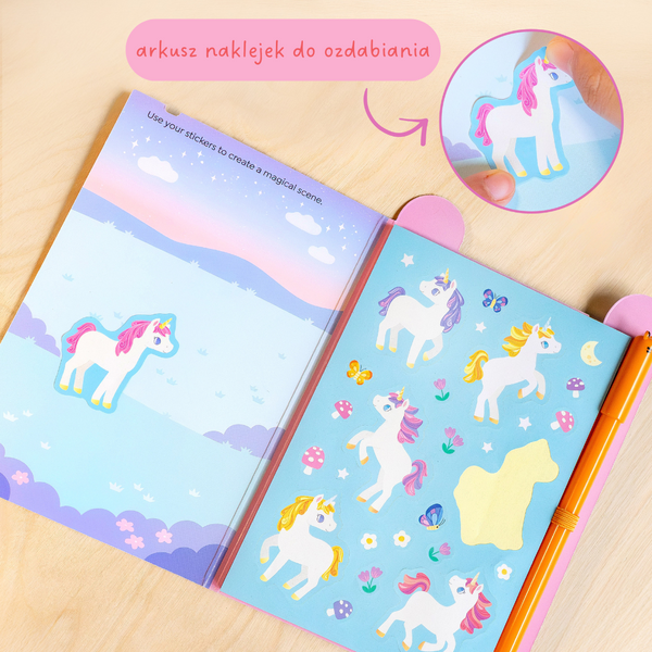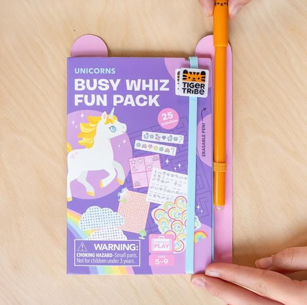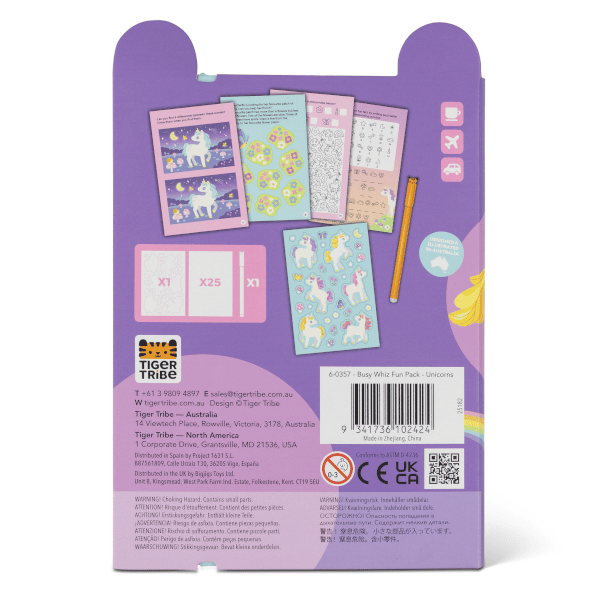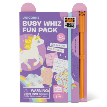 Tiger Tribe Paczka Pełna Frajdy – Jednorożce to kompaktowa książeczka aktywności „bez ekranu” dla dzieci 5–9 lat. W środku znajdziesz 25 stron zadań (m.in. labirynty i zagadki), pisak zmazywalny do wielokrotnej zabawy, naklejki oraz scenkę do kreatywnego opowiadania historii. Idealna do domu i w podróży. Uwaga: małe elementy – nieodpowiednie dla dzieci poniżej 3 lat.