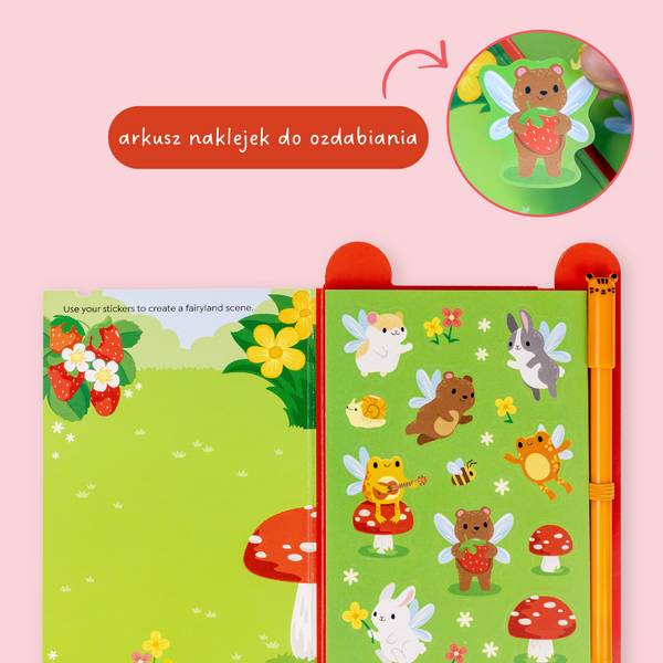 Kompaktowa książeczka aktywności z motywem wróżek: 25 stron zadań, zmazywalny pisak i arkusz naklejek. Idealna w podróży. Dla dzieci 5–9 lat.