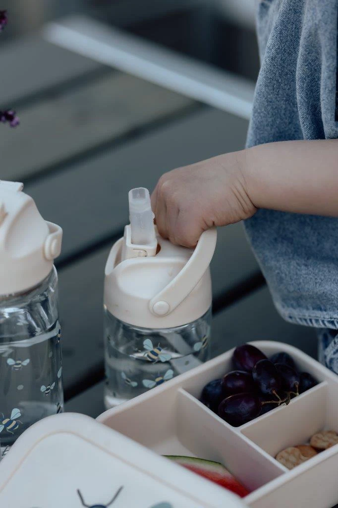 Tritanowa butelka Vanilla Copenhagen Honeybee 350 ml z miękkim, niekapiącym ustnikiem i słomką. Lekka, wygodna dla maluchów, dobra do żłobka, przedszkola i na wyjazdy.