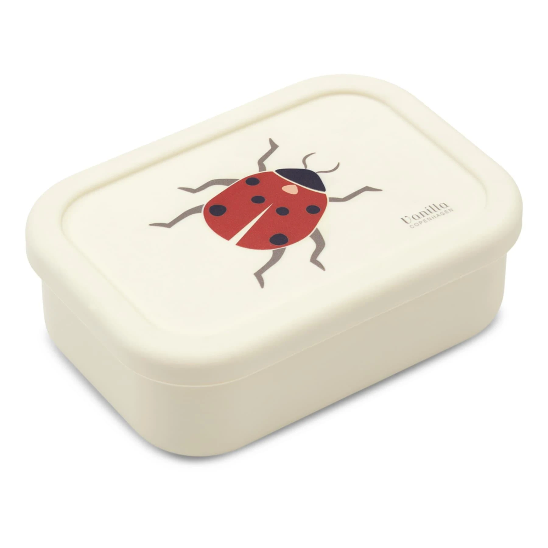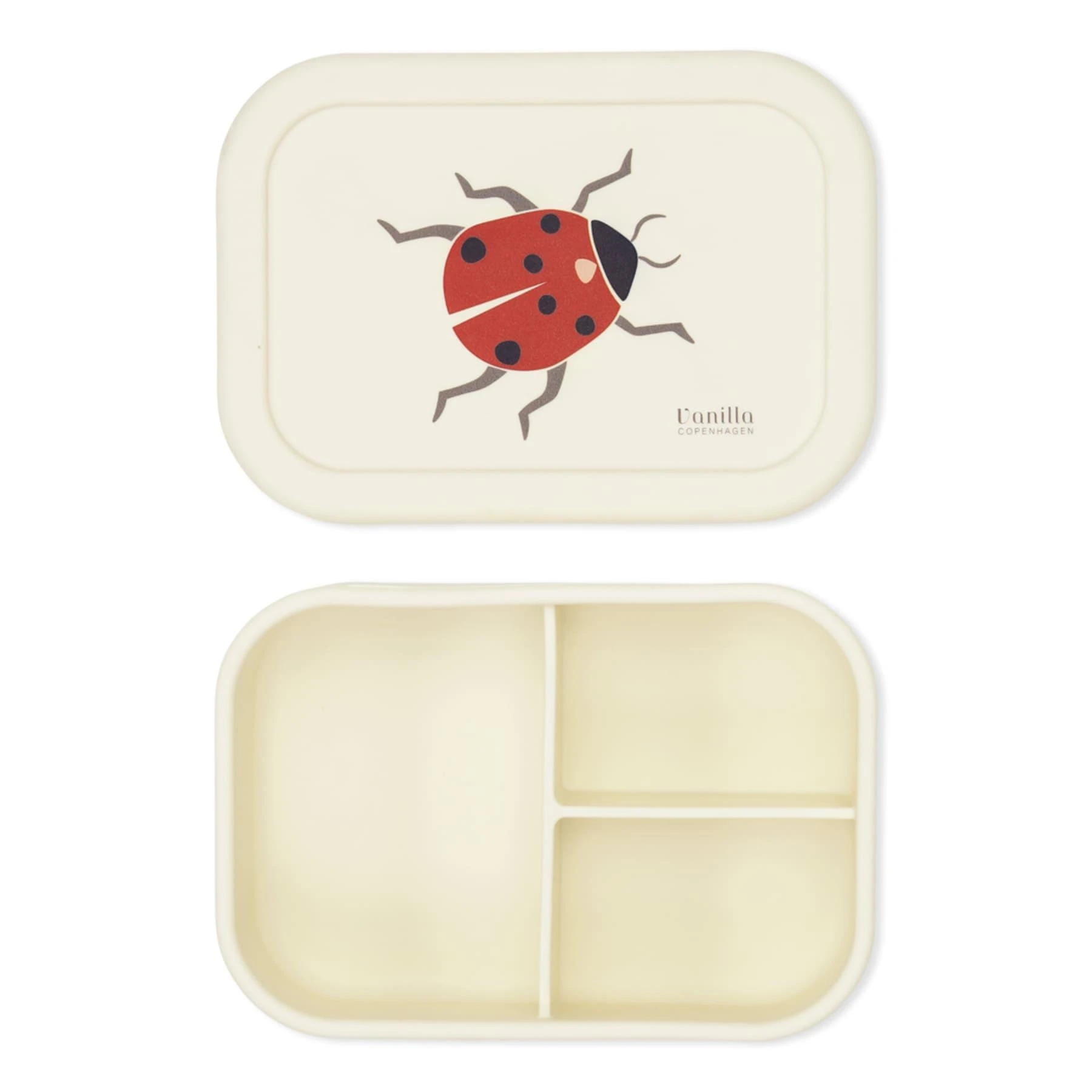 Lunchbox silikonowy Vanilla Copenhagen z motywem biedronki, 700 ml. Ma przegródkę, dzięki której łatwo spakować różne przekąski osobno. Dobry do przedszkola, szkoły i w podróży.