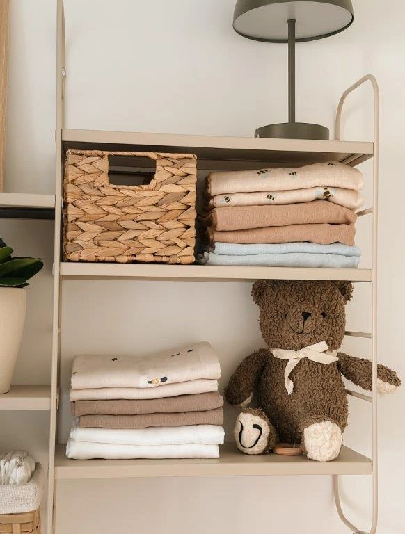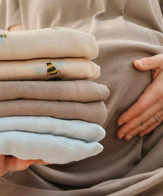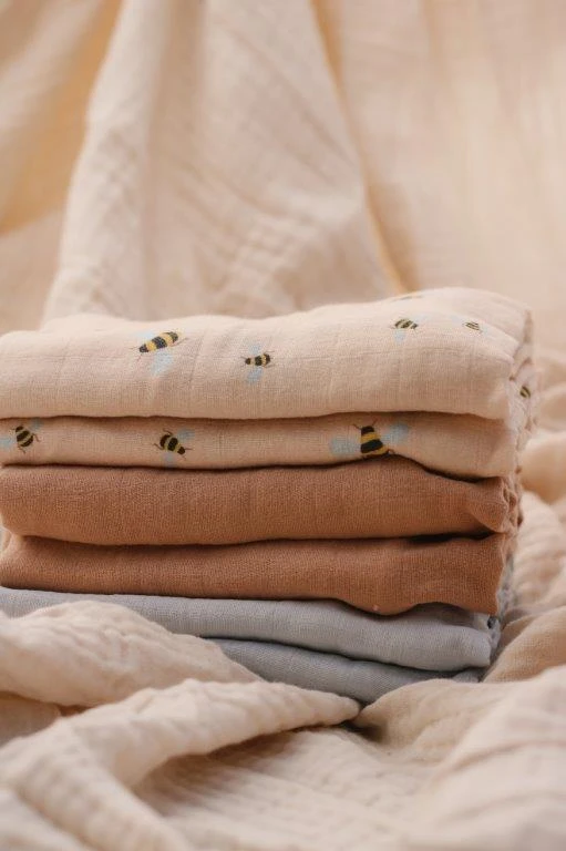 Zestaw utrzymany jest w spokojnych, naturalnych odcieniach beżu, szarości i błękitu, a część pieluszek ozdobiono delikatnym motywem pszczółek. Lekki, oddychający materiał sprawia, że pieluszki są wygodne w codziennym użytkowaniu i łatwo wpisują się w potrzeby wyprawki.
