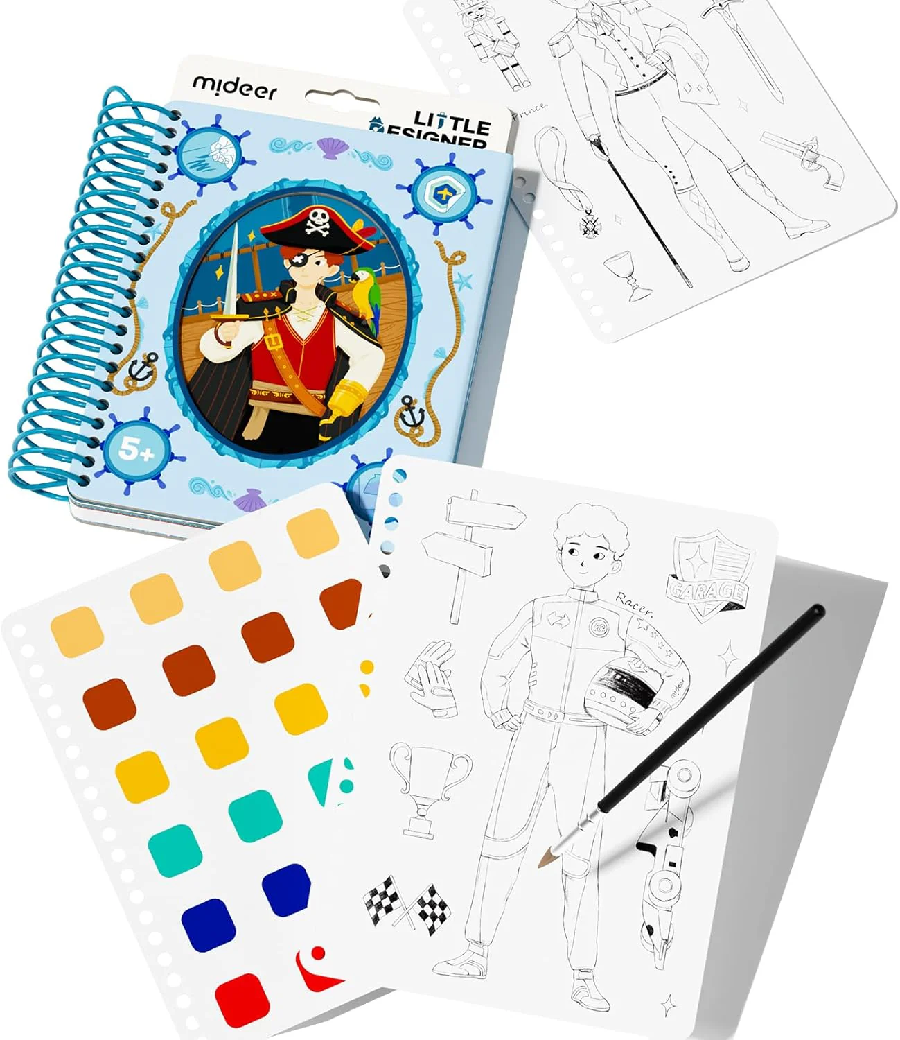 W środku znajdują się pędzelek, szablony do kolorowania, naklejki, wycięte wzory ubrań, materiał do dekoracji oraz różnokolorowe pigmenty. Dzięki temu dziecko może łączyć różne elementy i tworzyć własne wersje stylizacji krok po kroku.